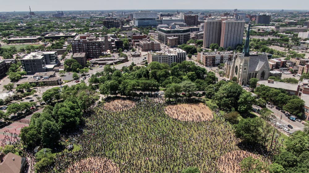 An aerial photo made with a drone shows a large group gathered in Union Park to protest the arrest of George Floyd, who later died in police custody, in Chicago, Illinois