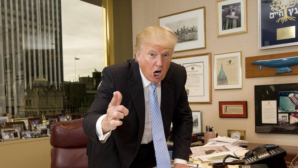 Trump styles his ‘You’re fired!’ pose in his Trump Tower office in June 2012. At the time he was known as a reality TV star on The Apprentice