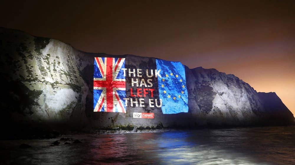 A large pro-EU banner is projected onto Ramsgate cliff in Kent