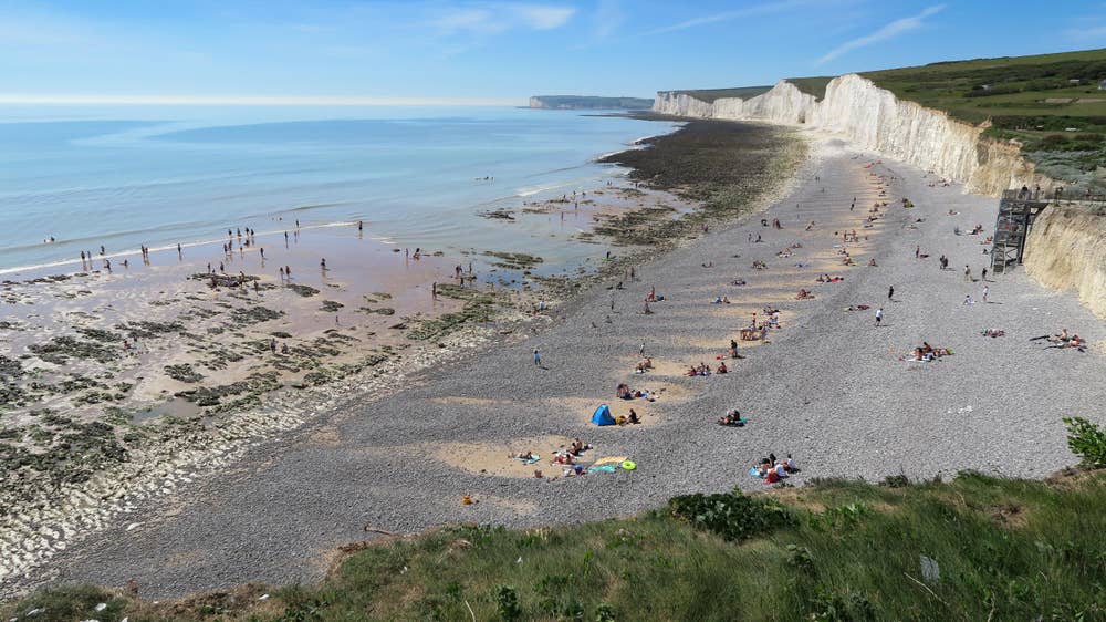 People enjoy the sunshine on Birling Gap beach on May 20, 2020 near Eastbourne
