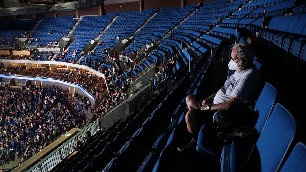 A Trump supporter sits in the upper rows of the BOK Centre in Tulsa, Oklahoma ahead of a campaign rally. There were reports of far lower numbers attending than the president’s team had predicted