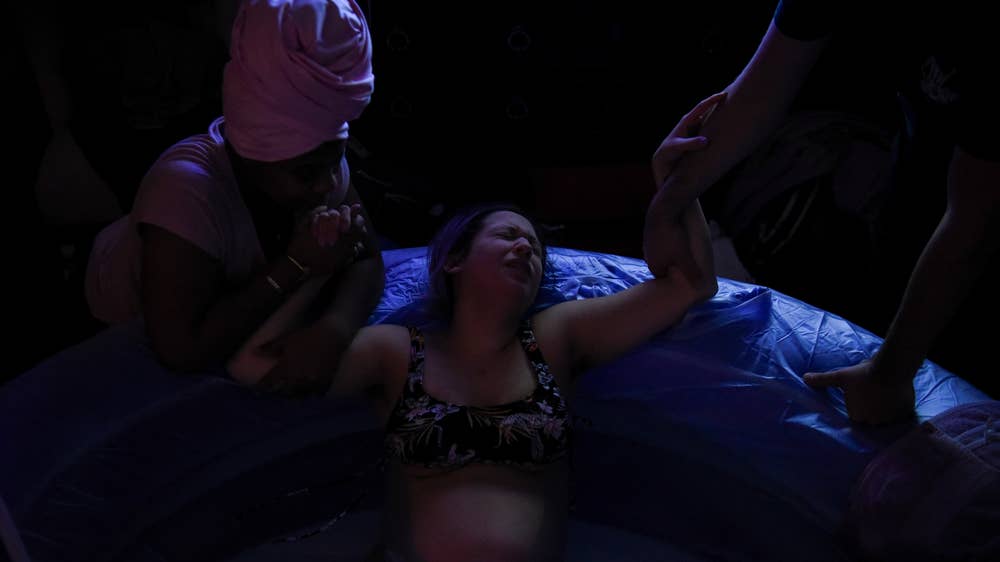 Nancy is supported by Ryan and Nichollette as she experiences contractions while laboring at the home of Pedroza’s licensed midwife, Susan Taylor