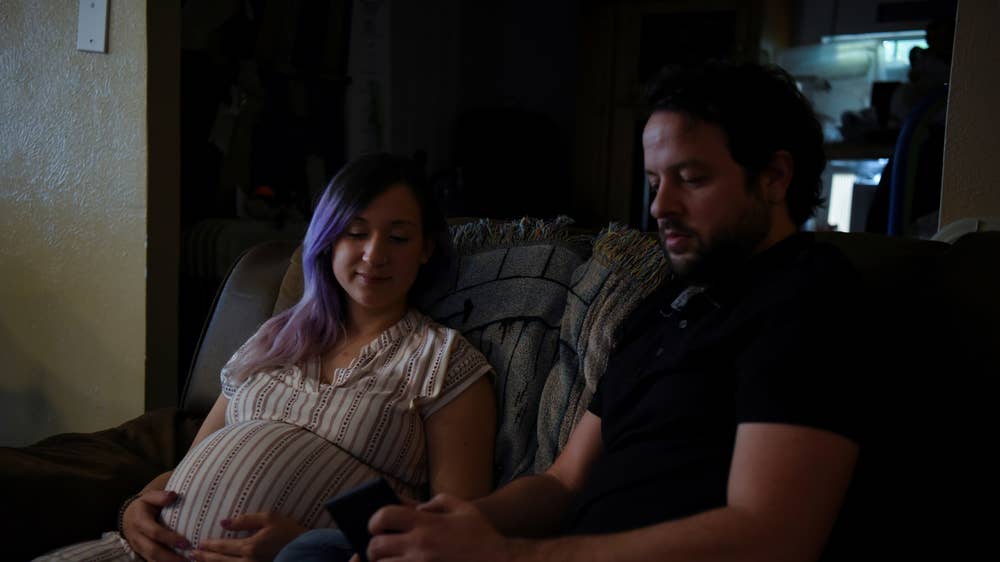 Nancy Pedroza, 27, who is pregnant, sits next to Ryan Morgan, 30, her partner and father to their unborn child, as they relax at Pedroza’s parent’s house, where they currently live, during the coronavirus disease (COVID-19) outbreak in Fort Worth, Texas