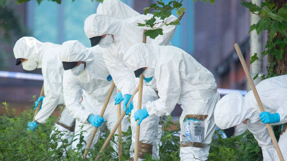 Police forensics officers carry out a search near Forbury Gardens, in Reading town centre, the scene of a multiple stabbing attack which took place at around 7pm on Saturday, leaving three people dead and another three seriously injured
