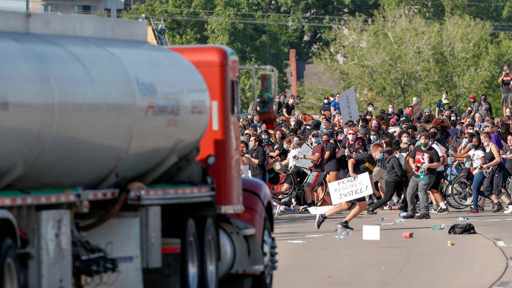 Protesters scatter as a tanker truck drives towards them on 35W highway during a demonstration against police violence following the killing of George Floyd