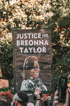 A protester in Atlanta holds a sign with a picture of Breonna Taylor, a Black woman who was shot by police in her home earlier this year. (Unsplash/Maria Oswalt)