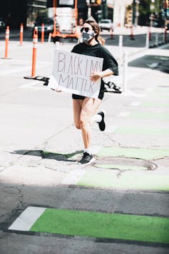 A woman wears a face mask during a protest. (Unsplash/Logan Weaver)