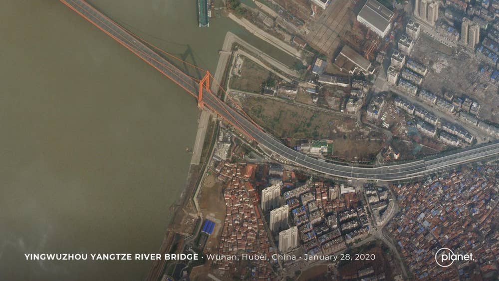 Yingwuzhou Yangtze River Bridge in Wuhan, China on 28 January 2020 after the city is put under lockdown due to the outbreak of the new coronavirus