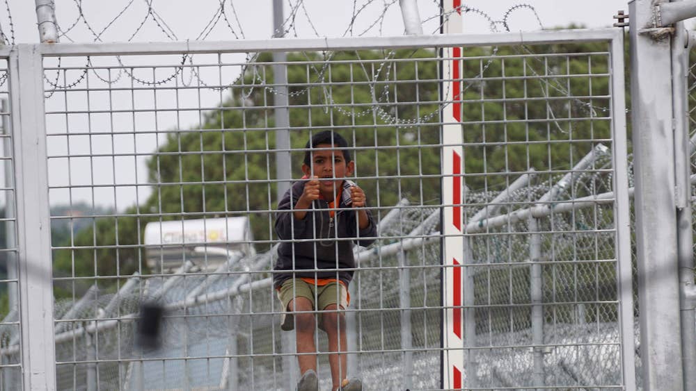 A child looks through the fence at the Moria detention camp for migrants and refugees at the island of Lesbos on May 24, 2016.